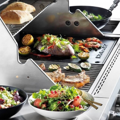 KitchenAid technology gives this BBQ the ultimate temperature and cooking control. Angled flame tamers and 304 Stainless Steel burners create even heat across the entire cooking surface. The KitchenAid signature control knobs are fitted with continuous ignition and LED downlights lights for easy identification. The grill is made from the highest quality 304-grade stainless steel with a fully welded double skin roasting hood fitted with a large temperature gauge and the LED downlights allow you to cook well into the evening.