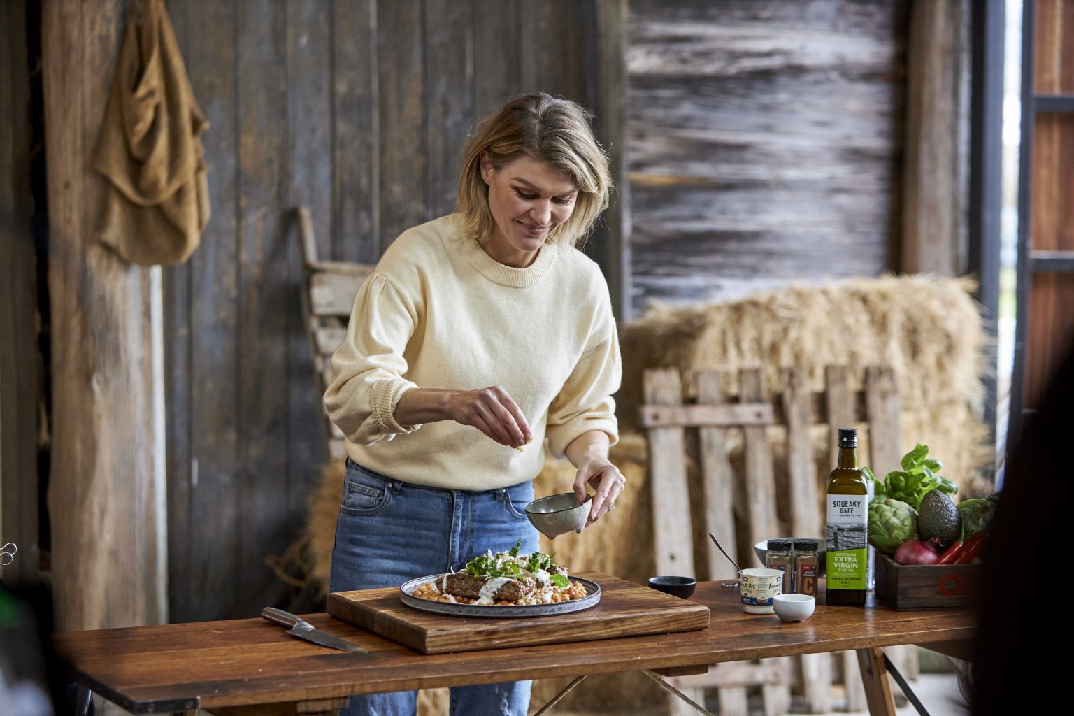 Spread the tomato sauce & chickpeas all over the base of the serving plate. Top with the kebabs and drizzle over the yoghurt. Scatter with the onion and mint salad and serve with warm flatbreads.